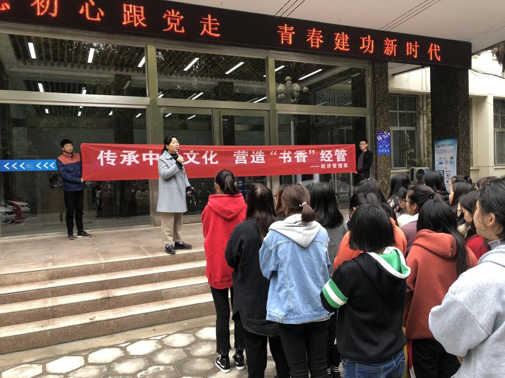 2018年11月7日10:00,经济管理系在图书馆前举行了“书香经管”活动启动仪式。仪式通过强调书籍是人类进步的阶梯,倡导同学们要热爱读书。系主任肖文珍在讲话中指出,同学们要多读书、读好书,让书走进生活,弘扬读书学习的文明风尚。