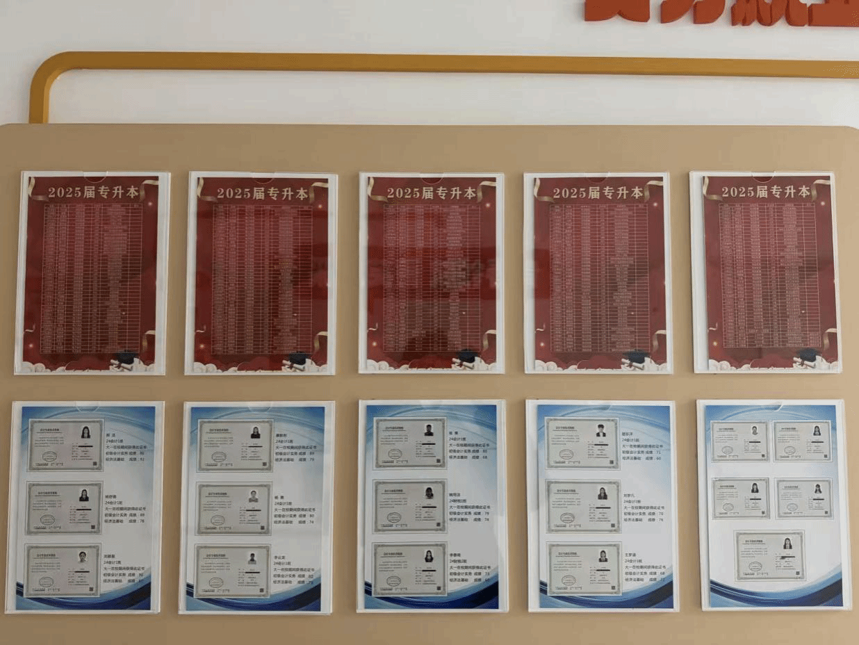 此次主题文化墙聚焦学子成长成才关键节点,集中呈现在校学子初级会计职业资格证书考取成果及历届学长学姐专升本成功典型案例。文化墙正式亮相后,迅速成为学院文化建设的亮点与师生关注的焦点。课间及课后时段,常有学子驻足观摩、交流探讨,或分享备考心得,或记录优秀案例中的学习方法与经验技巧。不少同学表示,通过学习身边榜样的奋斗事迹,不仅让自身奋斗目标更清晰明确,也进一步增强了克服学习困难的信心与决心,深切感受到“榜样就在身边、奋斗可及可学”的正能量。