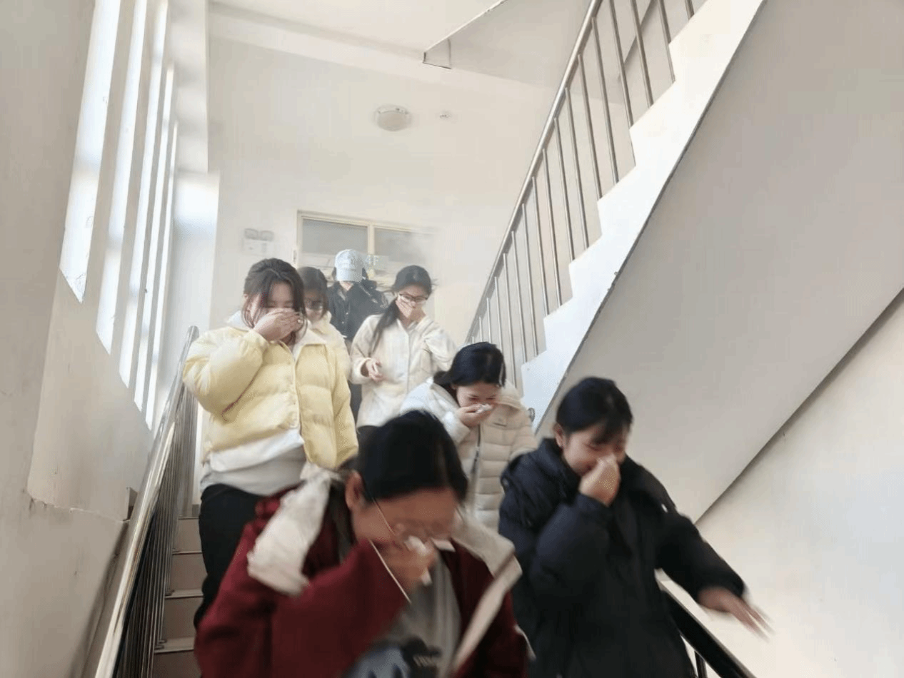 25日下午3时30分,演练正式开始。模拟火灾烟雾在宿舍楼内迅速弥漫,刺耳的消防警报随即响彻校园。同学们临“危”不乱,在志愿者引导下,迅速用湿毛巾捂住口鼻,采取弯腰低姿方式,沿着预定疏散路线快速、有序撤离。整个过程紧张有序,各环节衔接紧密,仅用时3分28秒,全体参演学生均安全撤离至指定区域,展现了良好的应急素养。