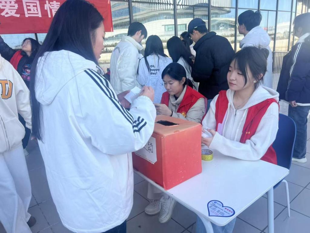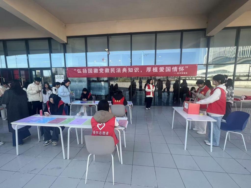 为深入贯彻法治理念,大力弘扬爱国主义精神,提升大学生对国徽党徽及民法典等重要知识的认知水平,经济管理系11月30日在餐厅前开展“弘扬国徽党徽民法典知识,厚植爱国情怀”主题活动,经济管理系同学踊跃参加。