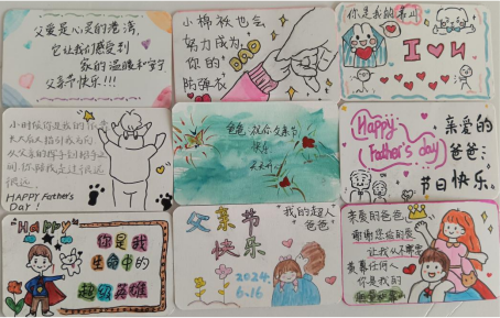 活动由制作贺卡、祝福墙、签字留名三个部分组成。活动中,同学们大家拿起手中的笔,将对父亲的感激、祝福和寄语诉诸纸上,分享自己与父亲的故事,把平时羞于表达的爱通过语言、行动等方式表达出来。一张张承载着真挚情感的贺卡,展示着同学们对父亲的爱。